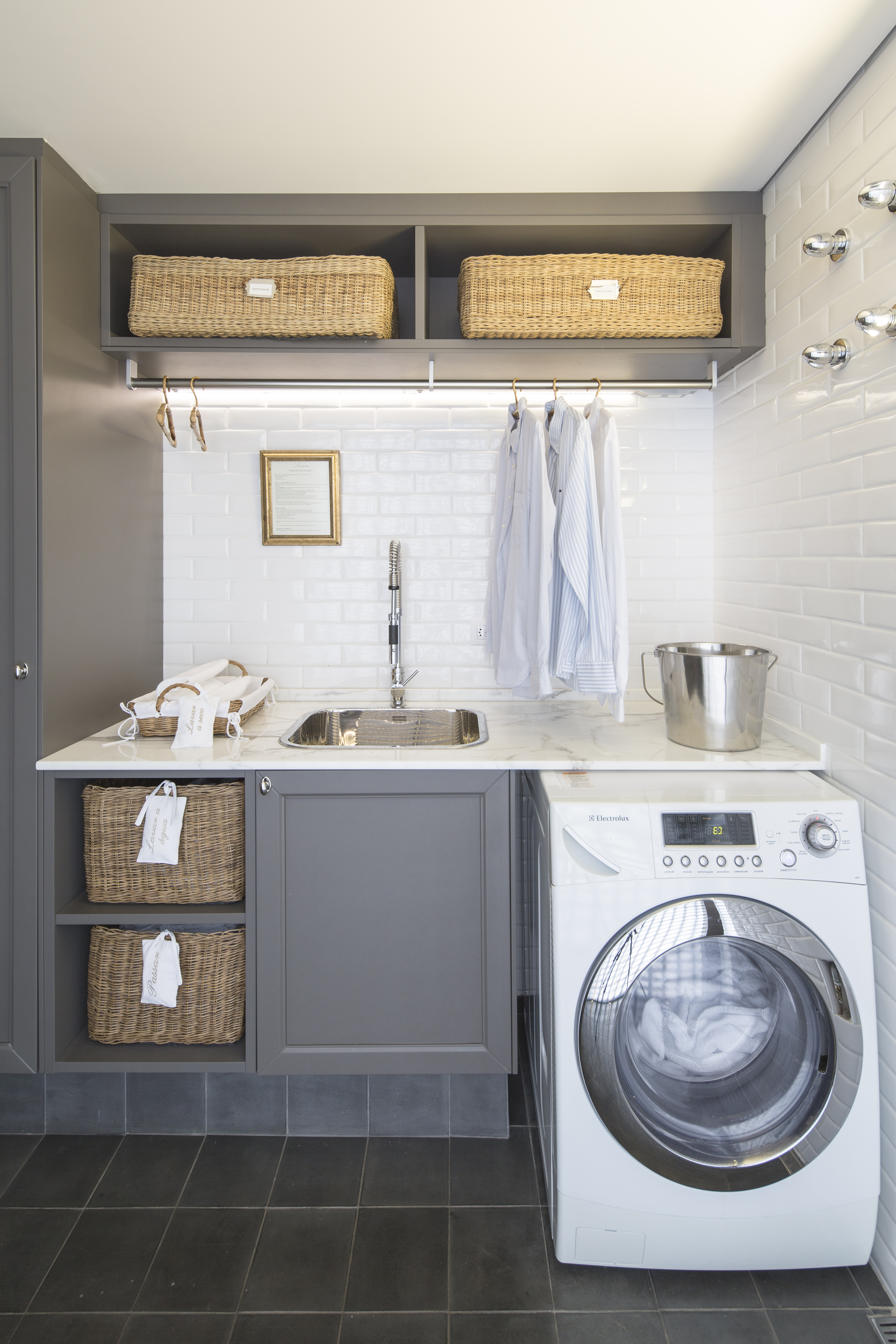 O bom planejamento dos gabinetes pode transformar completamente uma lavanderia! Lembrando um banheiro, esta possui armários cinza – cor tendência na decoração, usada como neutra – e subway tiles branquinhos. Nichos com cestos separam as roupas. O projeto é dos arquitetos Fabrício Cardoso e Isabel Flecha.