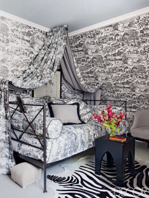 1. Ousado! O papel de parede deste quarto é replicado no tecido do dossel da cama, assim como em todo o estofado da mesma. Assim, o canto do dormir se torna um camuflado cinza – incrivelmente discreto, já que possui só dois tons, e cheio de textura.