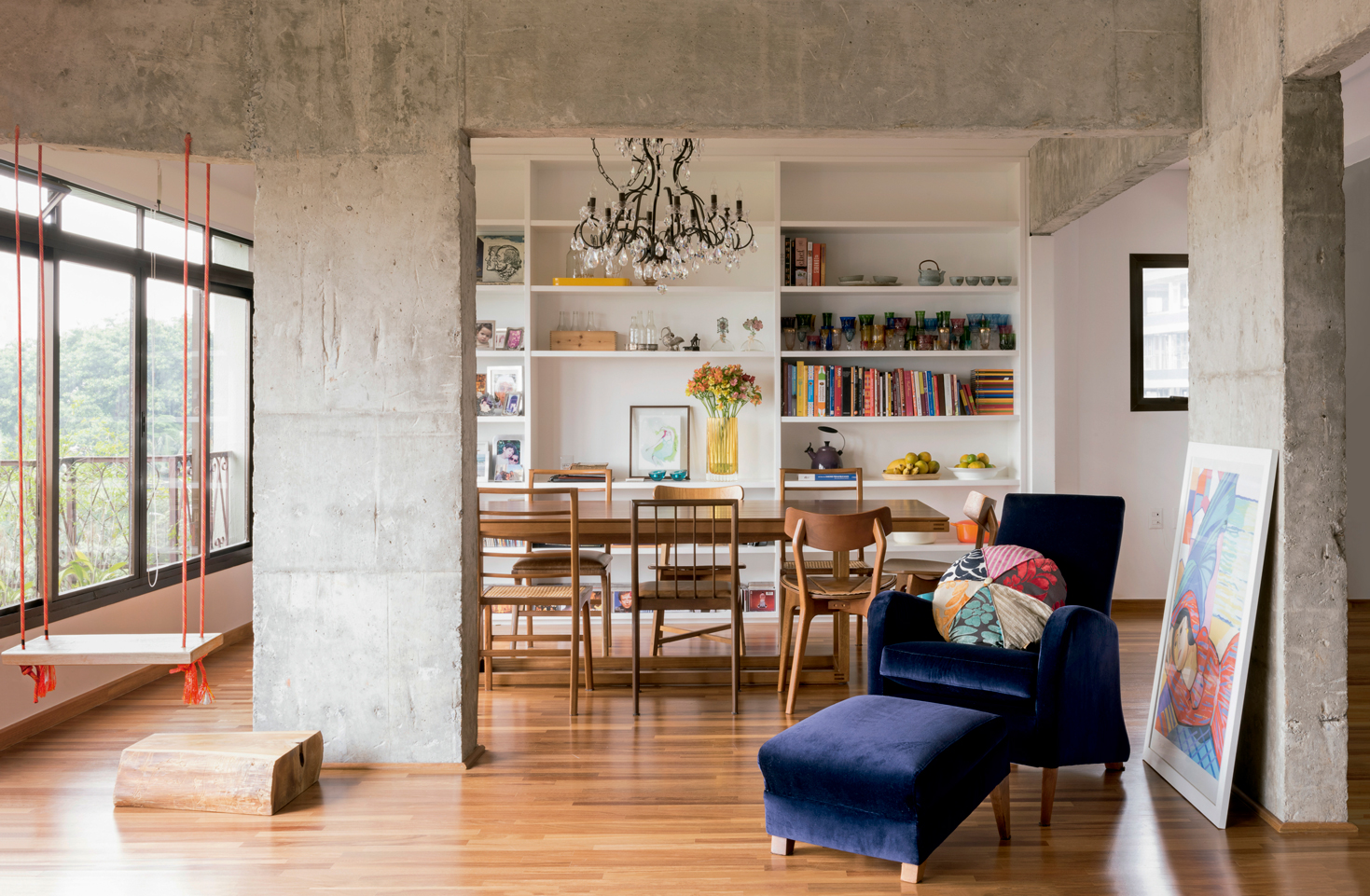 Há um clima de felicidade no ar: a decoração suaviza a força bruta do concreto aparente e transforma o dúplex – onde vivem um casal de jornalistas e seus dois filhos adolescentes – num lugar repleto de memórias queridas, peças de design, obras de arte e conforto de sobra.