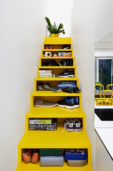 Por ser aberta, é possível guardar sapatos, livros e outras coisas entre um degrau e outro. Além disso, tudo fica visível e ao alcance rápido, o que é bem prático.