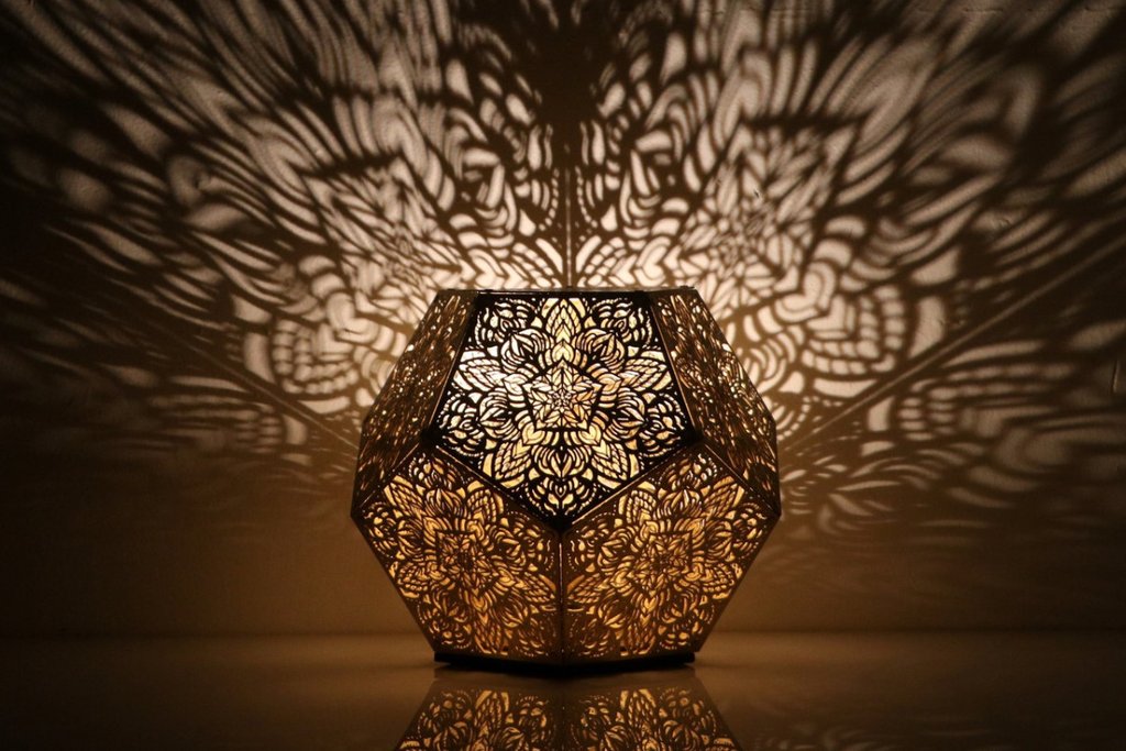 As luminárias da COZO são bem especiais: desenhadas em diferentes formatos geométricos, as peças levam padrões diversos em suas laterais vazadas que, por sua vez, são usadas para projetar imagens.