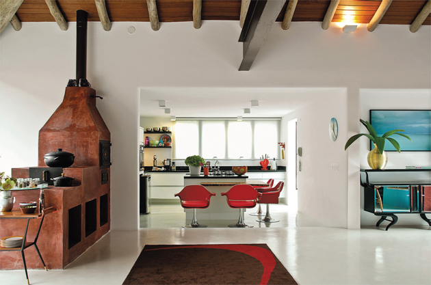 Sem dúvida, essa combinação requer alguns cuidados especiais para manter a qualidade do ar interno. O principal é garantir um bom sistema de ventilação e exaustão. Se seu espaço for reduzido e sem circulação de ar livre, você pode instalar uma coifa acima do fogão. Com esse estilo rústico, vão bem modelos de cobre ou ferro. Outra alternativa é o fogão a lenha ecológico, à venda no mercado. Preparado para ambientes internos, ele evita o refluxo de fumaça por meio de fechamentos específicos. Também existem adaptações para os modelos tradicionais, como chapas galvanizadas para o fechamento das bocas. Com relação à churrasqueira, devem ser observados os mesmos cuidados com a ventilação. Uma boa solução é adotar vidros temperados com 10 mm de espessura nas laterais, direcionando a fumaça para o duto da chaminé. Além de evitar que ela se espalhe pelo ambiente, esse recurso melhora a eficiência no preparo dos alimentos, uma vez que concentra o calor. Outra saída interessante é optar por churrasqueiras elétricas ou a gás. Próprias para ambientes internos, esses modelos podem vir com coifa ou exaustores.