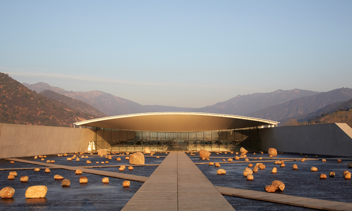 1. Vinícola Vik, em Milahue. Não é bom competir com a Cordilheira da Costa, no sul do Chile, e as planícies que parecem não ter fim. Respeitoso, o arquiteto Smiljan Radić criou um edifício semienterrado para produzir vinho e receber os turistas que degustam a bebida.