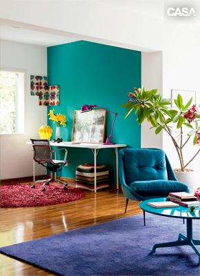 “Minha sala é branca, com a parede atrás do sofá azul-petróleo. Quero revestir o estofado de tecido turquesa e salpicá-lo de almofadas roxas. Ficaria bom? Que outras cores posso incluir na decoração para deixá-la mais quente?” Luciana Polastrini, por e-mail.