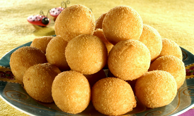Faça bolinhas pequenas com a massa e recheie. Passe as bolinhas na farinha de trigo, na clara e por último na farinha de rosca. Frite em óleo quente até que fiquem douradas. Sirva quente.