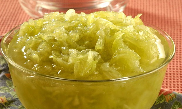 Pare de mexer e ferva até formar uma calda no ponto de fio fino. Acrescente o chuchu e cozinhe até que fique macio. Deixe esfriar e depois transfira para uma compoteira. Sirva na temperatura ambiente ou gelado.