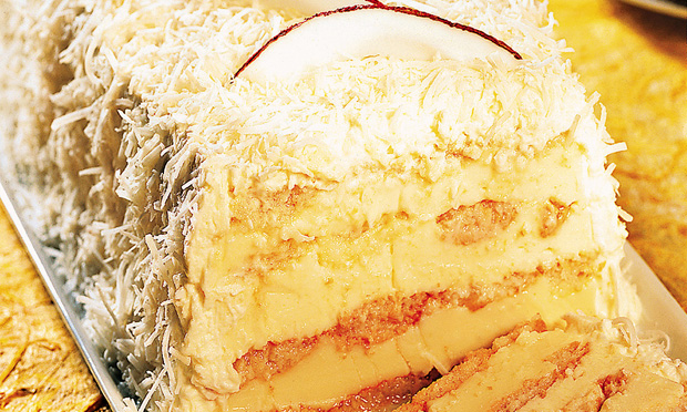 Numa panela misture o leite de coco, o açúcar e a maisena. Leve ao fogo médio, mexendo, até ferver. Tire do fogo, junte as gemas ligeiramente batidas e misture bem. Volte ao fogo baixo, sem parar de mexer, até engrossar. Tire do fogo e deixe esfriar. Umedeça os biscoitos no vinho misturado com a água e disponha-os no fundo de uma forma de bolo inglês forrada com papel-alumínio. Alterne camadas de biscoito e de creme, terminando com uma camada de biscoitos.