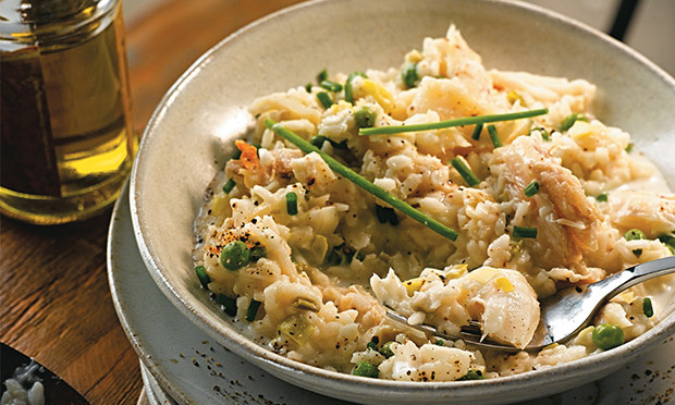 Em uma panela, leve ao fogo o leite, o louro e o bacalhau e cozinhe por cinco minutos. Escorra, reservando o líquido e o bacalhau separadamente. Desfie o peixe, retirando as espinhas e a pele, e reserve. Em uma panela funda, derreta metade da manteiga e refogue o alho-poró por dois minutos ou até murchar. Junte o alho e cozinhe por mais alguns minutos. Acrescente o arroz e refogue, mexendo, por um minuto. Despeje o vinho e cozinhe até o álcool evaporar. Vá acrescentando o caldo aos poucos, mexendo às vezes, até o arroz crescer. Adicione o leite reservado e o bacalhau e continue cozinhando. Nos últimos cinco minutos, junte a ervilha, o restante do caldo (se necessário) e cozinhe até ficar al dente. Fora do fogo, adicione a manteiga restante. Tempere com sal e pimenta. Sirva o risoto regado com o azeite e decorado com cebolinha verde.