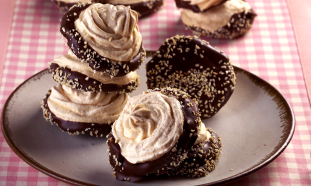 Asse por uma hora ou até dourar. Derreta o chocolate em banho-maria. Pegue cada merengue a banhe a parte inferior no chocolate e, em seguida, passe na castanha de caju picada. Seque sobre papel-manteiga.