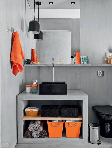 Cimento queimado e louças pretas são as estrelas deste ambiente de 3,65 m² - só não há espaço para a mesmice