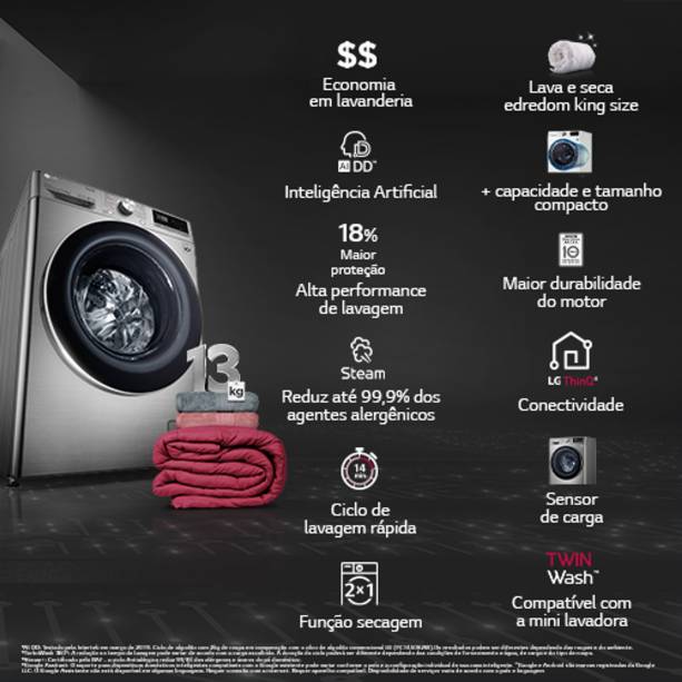 Além disso, apoiada pela tecnologia e conectividade do aplicativo LG ThinQ, a máquina lava e seca usa vapor para higienizar as roupas gentilmente e eliminar até 99,9% dos alergênicos e bactérias que podem causar alergia ou problemas respiratórios, com extrema eficiência e todo o cuidado com a família.