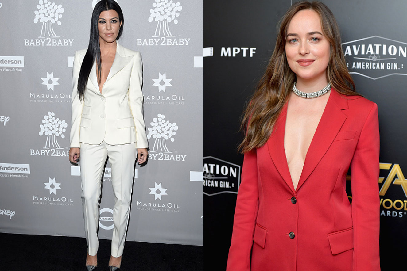No Hollywood Film Awards deste ano, premiação realizada no último domingo (5), a atriz Dakota Johnson, 28 anos, optou pela versão avermelhada com botões apenas na extremidade do paletó para valorizar o decote do casaco.