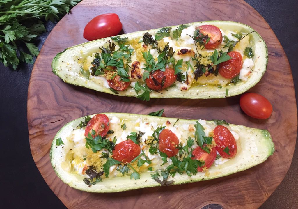 Cozinhe o painço na proporção de 1 xícara de painço para 2 xícaras de água. Feito isso, corte a abobrinha ao meio, no sentido vertical e retire a polpa. Tempere as duas partes com azeite, sal, pimenta e recheie com o painço cozido. Em seguida, salpique o queijo de cabra, a salsinha e finalize com os tomatinhos cortados e com um fio de azeite.