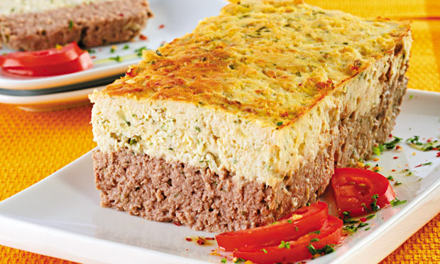 - Arrume a carne bovina em uma forma retangular untada e, por cima, coloque a carne de frango