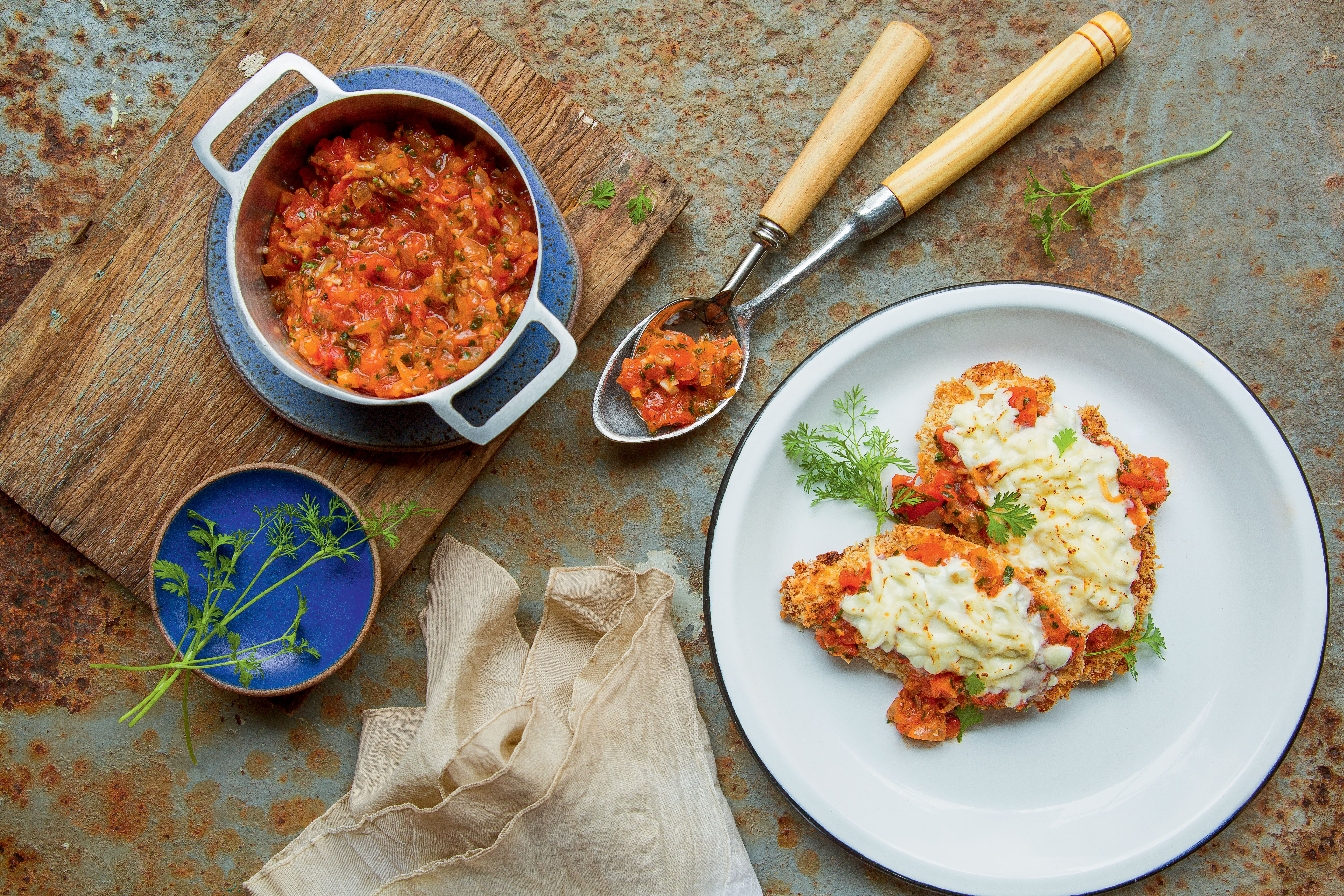 Retire, disponha o refogado de tomate sobre os filés e finalize com o queijo.