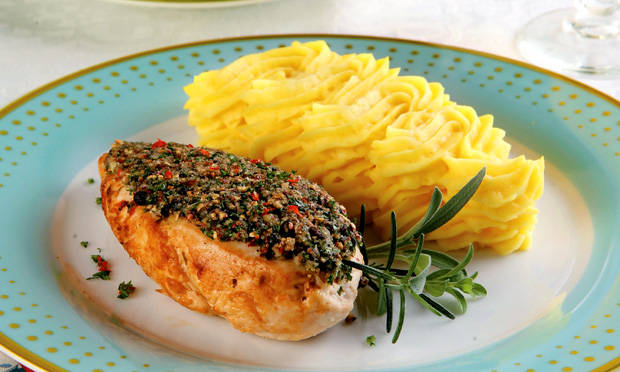 - Transfira o frango para uma assadeira untada com manteiga e pincele com o azeite restante