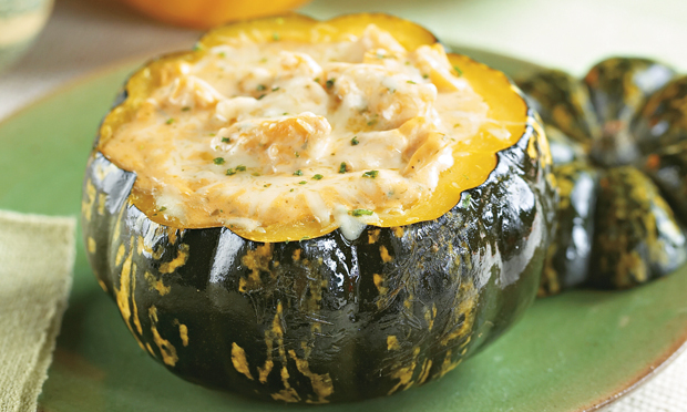 - Coloque na abóbora, cubra com a mussarela ralada, um pouco de coentro e um fio de azeite