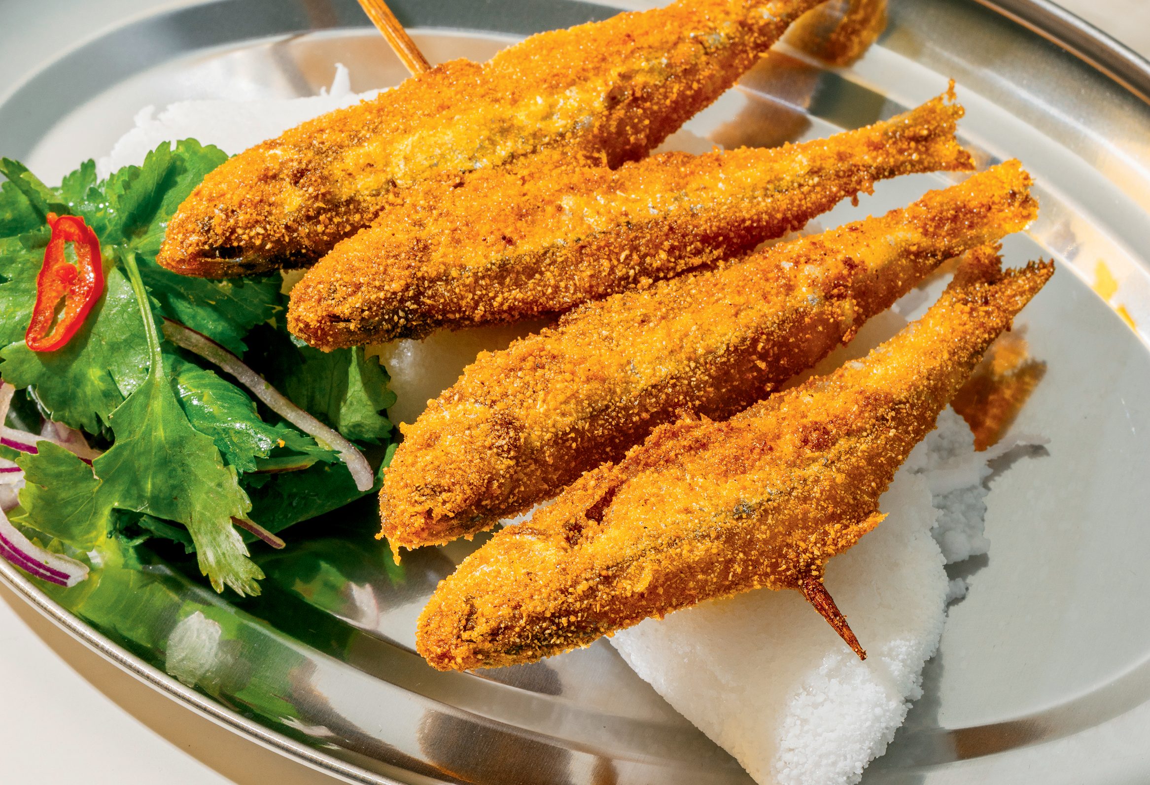 - Finalize com as manjubas fritas por cima num espeto e adicione coentro.