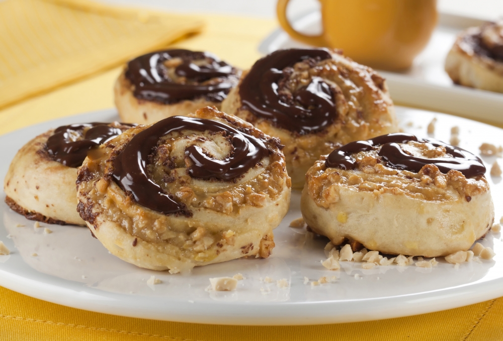 - Enrole como um rocambole, corte dez fatias e acomode-as em uma assadeira, untada com margarina