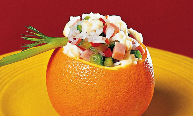 - Recheie as laranjas com a salada e, se quiser, decore com cebolinha verde