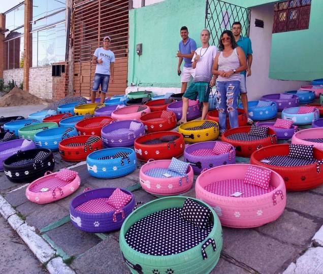 Quando não aproveitados em oficinas mecânicas, pneus carecas e bastante usados são descartados todos os dias em terrenos baldios e nas calçadas da cidade. O que poderia ficar acumulando água, e ser um local perfeito para o mosquito transmissor da Dengue, se transformou em camas confortáveis para os bichinhos terem uma boa soneca, além de uma fonte de renda para o artista.
