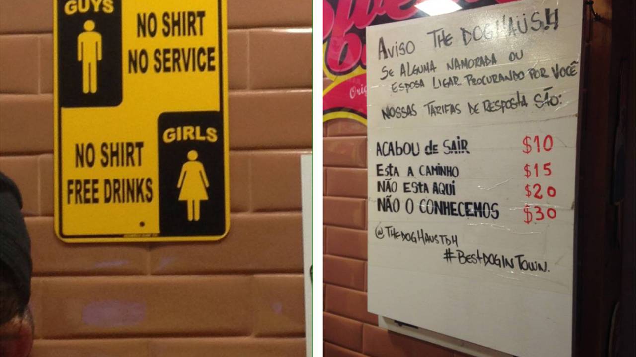 A placa em inglês diz: “Rapazes: sem camisa, sem atendimento | Garotas: sem camisa, bebidas grátis”