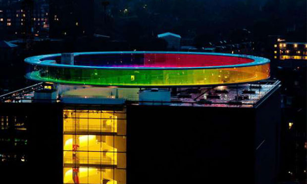 Localizada no topo do prédio do museu ARoS na Dinamarca, a instalação Your rainbow panorama do artista um pouco dinamarquês, um pouco islandês, Olafur Eliasson, cria um grande arco-íris em círculo que ocupa toda a extensão do edifício.